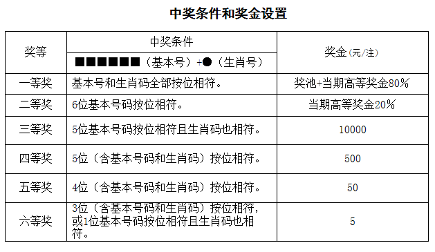 摇奖时先后摇出6个基本号码和1个生肖码。当期每注投注号码只有一次中奖机会,不得兼中兼得(另行设奖除外)。最高限额单注500万元。